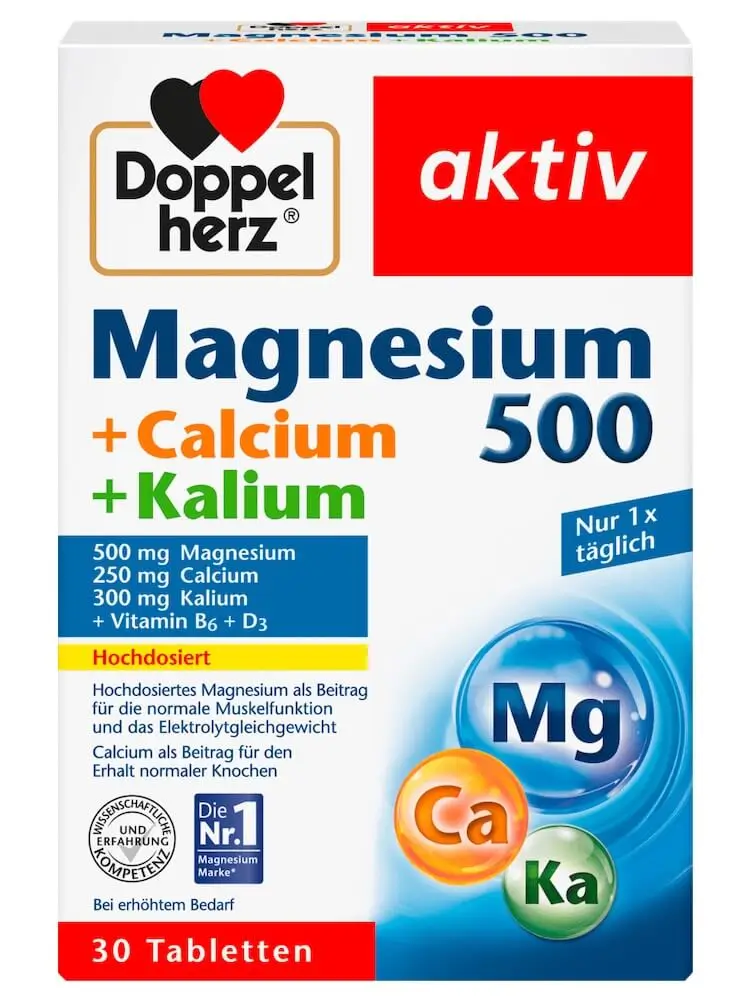 Mỗi viên Doppelherz Magnesium 500 Calcium Kalium chứa công thức cân bằng, bao gồm: